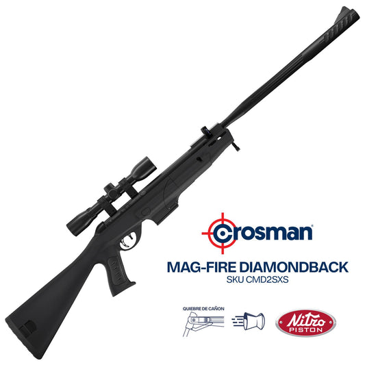 Kit Carabina Nitro Pistón Crosman Mag-Fire Diamondback Cal. 5.5 con Mira Telescópica + Lata de Diábolos